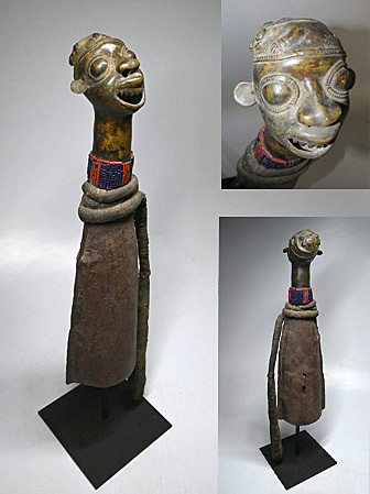 Among sounding instruments of the Cameroon Grassfields, is this tall hand hammered iron and cast bronze bell with attached striker. The Bronze cast head finial on top is well rendered and likely cast using the lost wax method, making it unique. On top of the head is a cap with a large lizard. This Bamileke lizard refers to symbolic motifs in Cameroon Grasslands culture, representing royal power, duality, and adaptability. These figures are a key emblem for chiefs and, sometimes, symbolize the spider’s wisdom, a core spiritual and cultural belief, symbolizing divine intelligence, ancestral connection, and royal authority.