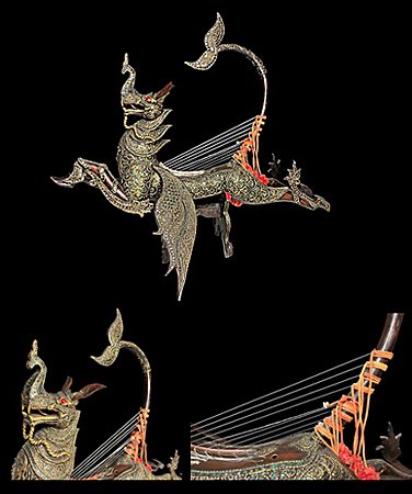 In Burma, Buddhism was introduced through trade relations with India. While there is no single instrument in Buddhism officially named the “flying dragon harp,” several historical and cultural connections link dragons and harp-like instruments. An example is the Yazh (or Yaazh), an ancient, harp-like string instrument central to Tamil music and culture, referenced in Sangam literature for over 2,000 years. It is known for its ethereal sound and arched frame (often with a mythological creature’s head like a Yali). The instrument became obsolete in India by the medieval era with the rise of veena-like instruments.