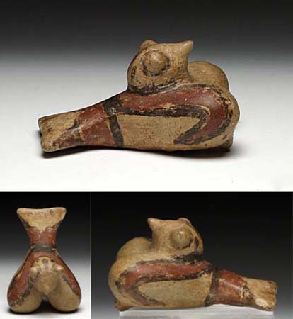 This bird whistle has two fingerholes on the breast, that allows variation of pitch.  The end of the tail has a whistle hole that serves as the mouthpiece.  Sometimes, the sound it creates mimics the creature represented; however little is known about how they were used.  This whistle still functions quite well.