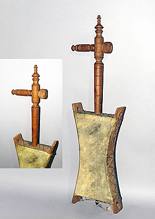 This bowed Egyptian rebab (rebaba, rababa) is of the long necked, spike fiddle type that comes from the Bedouin people mainly located in the Arabian Peninsula region and Egypt. It has a wooden neck and tuning peg for the one gut string. Animal hide is stretched across the frame on both sides and is attached with leather stitching. The finial, neck, and tuning peg are ornately carved and at the bottom is a metal spike foot.