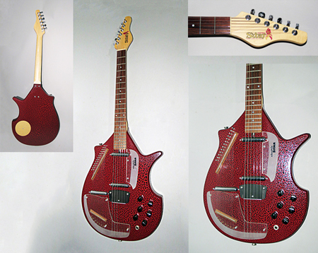 This Jones Master Model Electric Sitar Guitar is a clone of an original 1967 Vincent Bell Coral Sitar built by Danelectro but with much tighter construction and hand wound lipstick pickups made by Jerry Jones – two for the sitar and one for the 13-sympathetic string harp that can be tuned to any key or scale each with its own volume and tone control. The cool red “gator” finish, along with the clear plexiglass pickguard and tailpiece cover, gives the instrument a very psychedelic look.