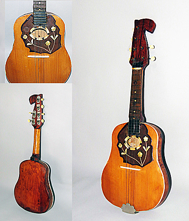 This is one of several tamburicas in this collection made by tambura maker George Selinshick (1894 – 1979) from Pittsburgh PA. It measures the size of a larger ‘Bisernica’ and is a tenor-shaped guitar. The ‘Bisernica’ plays the melody and harmony in the highest octaves and is the soprano lead voice of the orchestra. The instrument is finely detailed with ornate features including trim around the front and back edges of the resonator body. The sound hole is surrounded by dark wood and blocks of MOP. Decorative flowers and leafy vines in MOP are implanted on the dark wood. There are four pegs on the left side of the ‘f-shaped’ peghead and two on the right.