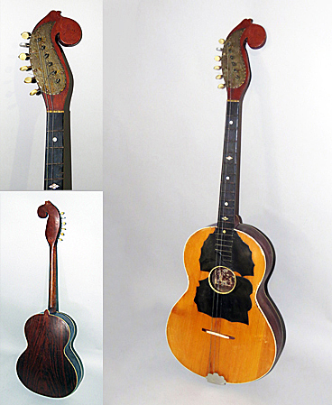 This tamburica is made by Ivan J Hlad (1888-1975) of the Tamburitza Mfg. Co. in Chicago, Illinois.  It is called a ‘Brac’ or ‘Basprim,’ and is a tenor shaped guitar.  The ‘Brac’ plays the melody and harmony in the mid-range octaves.  This ‘Brac’ has 6 pegs on the left side of the f-shaped peghead.  There is MOP inlay between some of the metal frets on the neck, and MOP outlines the front and back of sound resonator.