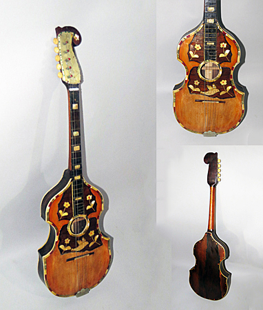 This is one of several tamburicas in this collection made by tambura maker George Selinshick (1894 – 1979) from Pittsburgh PA.  It is called a ‘Brac’ or ‘Basprim,’ and is a tenor shaped guitar.  The ‘Brac’ plays the melody and harmony in the mid-range octaves. The instrument is finely detailed with ornate features including trimming around the front edges and sound hole with MOP.  Surrounding the sound hole is darker wood with an image of a bird in flight, and flowers with leaf stems, all made from MOP.  A metal plate etched with vines and flower buds, covers the f-shaped peghead with a six-leaf MOP at the end.  There are five pegs on the left side of the peghead.  The front and back of the resonator is also trimmed with MOP around the edges.