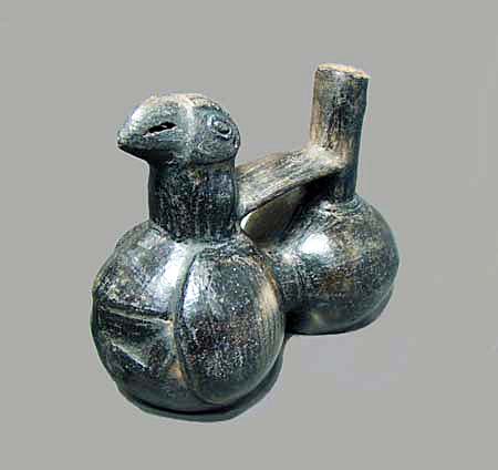 This Chimú Whistling Jar is a mold-formed blackware pottery vessel, with two spherical chambers that produce a whistling sound. The object is partially filled with water/liquid in the plain cylindrical spout that leads to the bottom chambers. When tilted forward so that the water/liquid in one chamber moves to the second chamber, it forces the air to pass up through the neck and opening in the beak of this seabird head creating a whistling sound. It is believed that the Chimú would play several whistling jars at once to create a relaxing and meditative atmosphere.