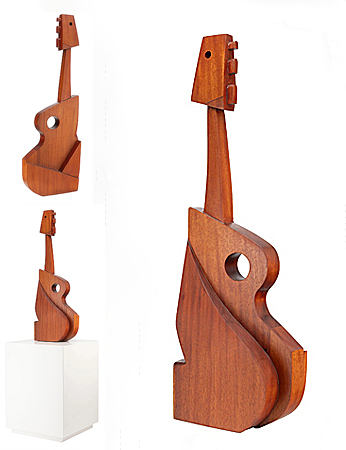 Mexico City-born Rafael Navarro is a self-taught artist whose works combine surrealism, symbolism, and the influence of Magritte, Picasso, and Frida Kahlo. He first studied veterinary medicine from the Universidad Nacional Autonoma de Mexico (UNAM), in Mexico City, but his true passion was always to become an artist. Navarro’s focus is on painting and sculpture. He also likes printmaking, metal work and jewelry, but most of his work relates to music, and musical instruments, mainly string instruments, as seen here with his sculpture of mahogany titled ‘Guitar’.